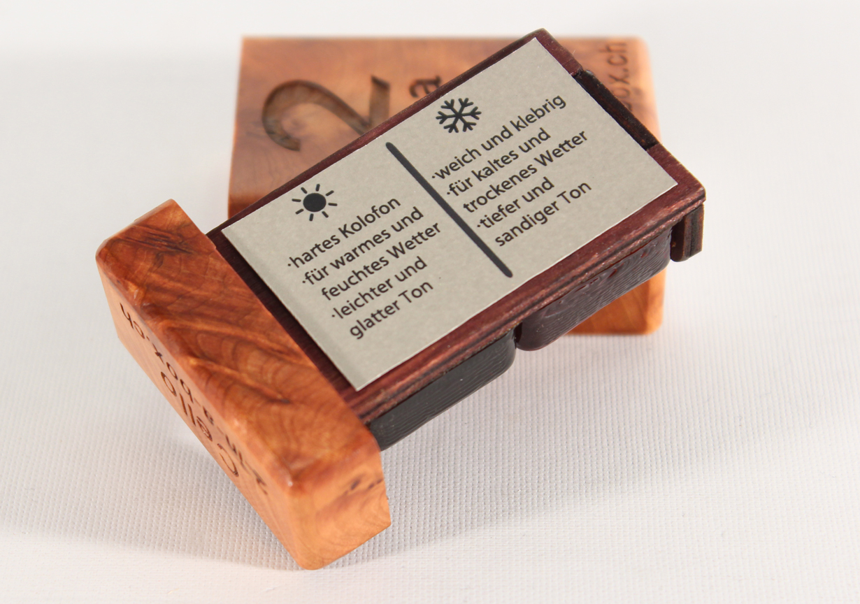 Unser Kolofonium "2-in-a-Box" ist aus besten Rohstoffen hergestellt. Das helle Harz, gesammelt im Winter, hinterlässt eine feinkörnigere und trockenere Schicht auf den Bogenhaaren. Daraus entsteht ein leichter und glatter Ton. Das dunkle Harz, gesammelt im Sommer, hinterlässt deutlich grössere und klebrigere Partikel, was einen tiefen und sandigen Ton zur Folge hat. Der Unterschied zwischen den beiden Kolofonien ist sehr subtil und hängt stark vom Bogen, dessen Haaren und der Spielweise ab. 2-in-a-Box“ ist perfekt für Musiker, welche in Breitengraden leben, in denen es die vier Jahreszeiten gibt, sowie solche, die oft auf Tournee sind. Das Kistchen von „2-in-a-Box“ ist aus wunderschönem Thuja-Wurzelholz. Erhältlich für: - Violine/Viola - Cello
