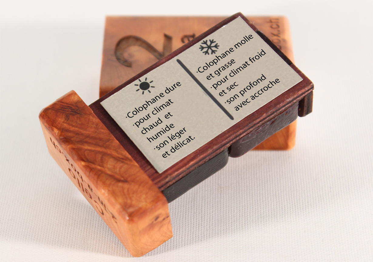 Nôtres colophanes "2-in-a-box" sont faites d'une matière première de grand qualité obtenue grâce à un procédé spécial d'extraction. La claire est élaboré avec une résine extraite pendant l'hiver et a une texture fine avec moins d'adhérence et par conséquences produit un son plus délicat et doux. Par contre la foncée faite avec une résine extraite pendant l'été a une texture moins raffinée avec plus d'adhérence, elle procure un son plus profond.