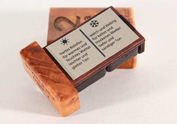 我々の商品 ”2-in-a-Box” は、厳選された高品質の素材を使って作られております。明るい色の松脂は、冬の間に採取された樹脂で作られており、きめが細かくべたつかないのが特徴です。そのため、非常に柔らかな音色をかもし出します。色の濃い松脂は、夏の間に採取された樹脂で作られており、きめが粗くしっとしりた材質により、非常に深くて手応えのある音を生み出します。
