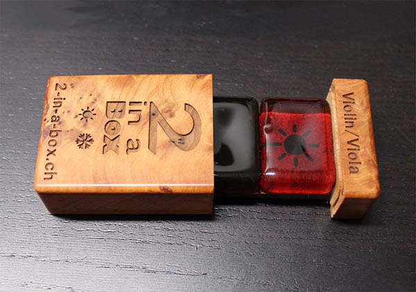 ”2-in-a-Box” は美しい木材の箱にしまわれています。ヴァイオリン・ヴィオラ用、チェロ用、と取り揃えております。